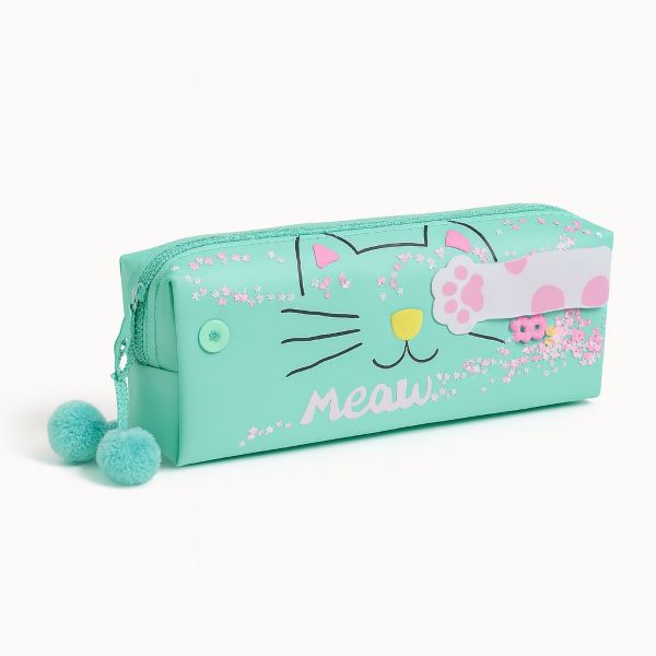 Cute and practical school pencil case featuring an adorable cat face design with star decorations and fluffy pom-pom zipper pullers. Its refreshing turquoise color makes it a perfect choice for kids and girls at school or for daily use.